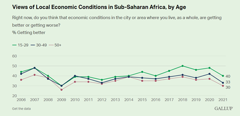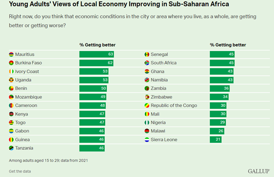 despite these challenges. (Gallup) JULY 11, 2022 Source: https://news.gallup.com/poll/394586/young-people-sub-saharan-africa-stay-optimistic.aspx |