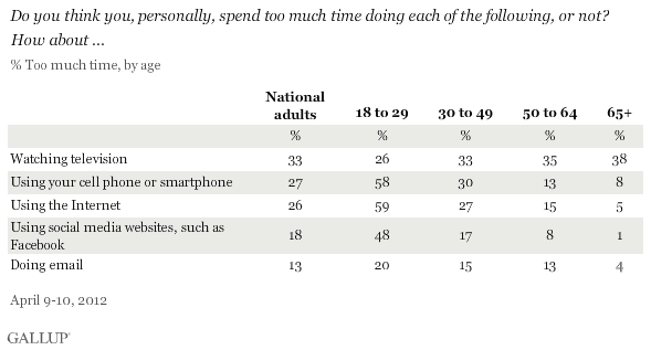 Overall, 33% of all U.S. adults report spending too much time watching television, 27% too much time on cell phones and smartphones, and 26% too much use of the Internet -- with fewer than two in 10 saying they spend too much time on social media sites or doing email.