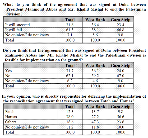 A recent Palestinians survey shows that a majority of Palestinians are pessimist about the Doha agreement for reconciliation between Fateh and Hamas. A majority of about six in ten believe that the only way to pressurize both parties for reconciliation is to arrange sit ins in the streets of Gaza and West Bank. (An Najah University)