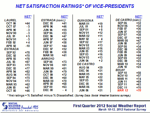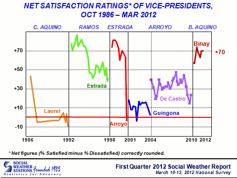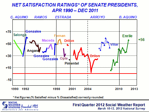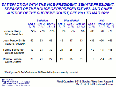 The First Quarter 2012 Social Weather Survey, conducted from March 10-13, 2012, found 79% satisfied and 9% dissatisfied with the performance of Vice-President Jejomar Binay, 69% satisfied and 13% dissatisfied with Senate President Juan Ponce Enrile, 39% satisfied and 21% dissatisfied with Speaker Sonny Belmonte, and 22% satisfied and 51% dissatisfied with Chief Justice Renato Corona. (SWS)