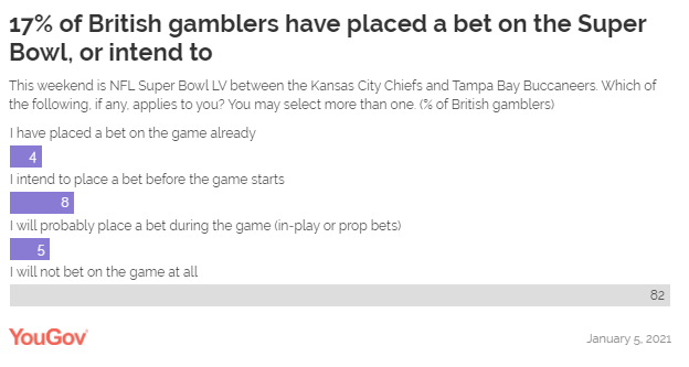 A YouGov Direct poll shows 17% of British adults who gamble say they have already placed a bet on the game (4%), intend to do so (8%) or will probably place an in-play or prop bet (5%). Super Bowl LV takes place on Sunday February 7 between the Kansas City Chiefs and the Tampa Bay Buccaneers.