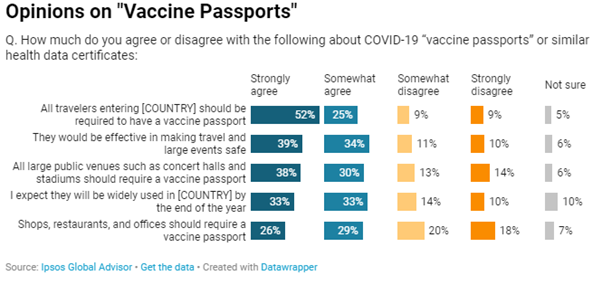 International Travel A new Ipsos survey for the World Economic Forum finds that, on average, about three in four adults across 28 countries agree that COVID-19 vaccine passports should be required of travelers to enter their country and that they would be effective in making travel and large events safe. About two in three say they should be required to access large public venues and as many expect they will be widely used in their country. On the other hand, only about half agree they should be required for shops, restaurants, and offices. That same survey conducted online among over 21,000 adults between March 26 and April 9, 2021 finds that, on average across 28 countries, just 50% are comfortable allowing their government to access their personal health information and 40% in the case of private companies. Another Ipsos survey conducted online among more than 15,000 adults across 12 countries, April 8-11, finds the global public sharply divided about whether only those who have been vaccinated should be allowed to take part in activities involving large groups of people such as taking public transit, flying, and attending cultural and sporting, or events. Read the World Economic Forum article. Detailed Findings Views about vaccine passports In the 28-country survey, Ipsos defined a COVID-19 vaccine passport as a record or health data certificate that would prove whether an individual has been vaccinated against COVID-19 or has recently tested negative for COVID-19, and that would be accessible electronically (e.g., on mobile phone apps) or as a printed document or card. On average, globally: