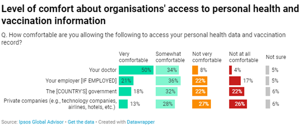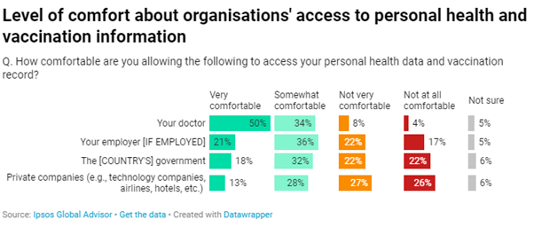 vaccination records In the survey conducted across 28 countries, over eight in ten on average say they are comfortable allowing their doctor access to their personal health data and vaccination records. However, just over half among those who are employed say so about their employer, half of all adults say so about their country’s government, and only four in ten adults about private companies. More precisely, on average globally: