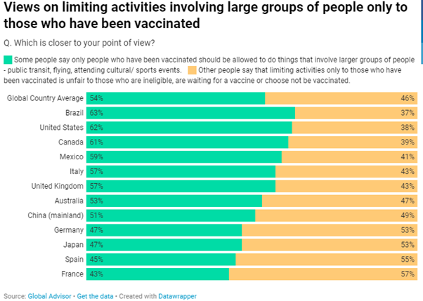 to customize the experience with in-app purchases. April 29, 2021 688-43-19/Poll In Germany, Three In Five People (60%) Say They Are Ready To Spend More On More Environmentally Friendly ProductsThe concept of sustainable development - both in terms of production and consumption - is at the heart of the concerns of many consumers around the world. Governments around the world have signed agreements guaranteeing intensified efforts to fight climate change, reduce CO2 emissions and protect the planet. According to the data collected via our Profiles tool , consumers are also inclined to take action to protect the environment. Given the growing awareness of environmental issues in recent years, YouGov asked consumers in different markets about their willingness to pay more for environmentally friendly products. Here we have focused on the people who are primarily or partially responsible for purchasing for their homes. The results of this study show that many consumers are willing to pay more to protect the environment. In Germany, three in five people (60%) say they are ready to spend more on more environmentally friendly products. The same goes for 58% of Americans, 57% of Britons, 53% of Australians and 50% of French people . In Japan, this feeling is not the majority. Indeed, only 27% of them agree that they would be prepared to pay more for products that are good for the environment. At the same time, 31% disagree and 42% neither agree nor disagree. Our Profiles tool also allows us to highlight generational differences. Thus, in France , young people are more likely to be ready to pay more for sustainable products than their elders: 55% of 18-24 year olds compared to 46% of 45-54 year olds. In a recent international white paper, YouGov studied the evolution of buying and consuming habits in 17 countries. This report devoted to the FMCG sector highlights the evolution of online shopping and reveals the impact of the pandemic on purchasing behavior . Additionally, it sheds light on consumer attitudes towards local and sustainable consumption in a post-COVID-19 world . (YouGov Germany) April 27, 2021 Source: https://fr.yougov.com/news/2021/04/27/consommateurs-achats-environnement/ 688-43-20/Poll Global Public Backs Covid-19 Vaccine Passports For International TravelA new Ipsos survey for the World Economic Forum finds that, on average, about three in four adults across 28 countries agree that COVID-19 vaccine passports should be required of travelers to enter their country and that they would be effective in making travel and large events safe. About two in three say they should be required to access large public venues and as many expect they will be widely used in their country. On the other hand, only about half agree they should be required for shops, restaurants, and offices. That same survey conducted online among over 21,000 adults between March 26 and April 9, 2021 finds that, on average across 28 countries, just 50% are comfortable allowing their government to access their personal health information and 40% in the case of private companies. Another Ipsos survey conducted online among more than 15,000 adults across 12 countries, April 8-11, finds the global public sharply divided about whether only those who have been vaccinated should be allowed to take part in activities involving large groups of people such as taking public transit, flying, and attending cultural and sporting, or events. Read the World Economic Forum article. Detailed Findings Views about vaccine passports In the 28-country survey, Ipsos defined a COVID-19 vaccine passport as a record or health data certificate that would prove whether an individual has been vaccinated against COVID-19 or has recently tested negative for COVID-19, and that would be accessible electronically (e.g., on mobile phone apps) or as a printed document or card. On average, globally: