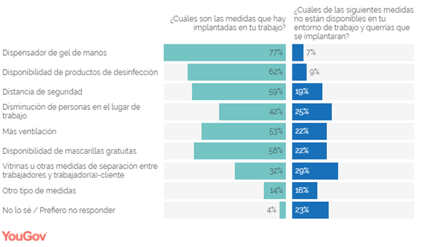 In relation to these last results, it is the two measures that occupy the bottom of the list of protection elements implemented in companies, the ones that top the list of measures most requested by workers; showcases (29%) and decrease in staff in the workplace (25%)