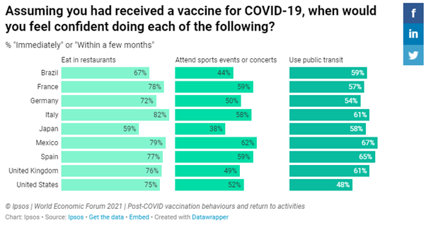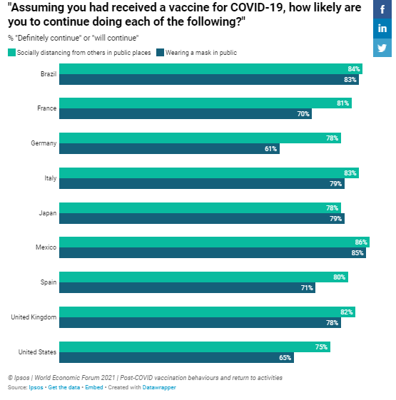 New York, NY, July 8, 2021 — A new Ipsos study conducted in partnership with the World Economic Forum finds a majority of adults in each of nine countries surveyed saying they are likely to continue socially distancing and wearing a mask in public if or when vaccinated against COVID-19. The study also highlights widely different levels of confidence across countries when it comes to resuming activities once vaccinated – eating in restaurants, attending sporting events or concerts, using public transportation, and flying domestically or internationally.