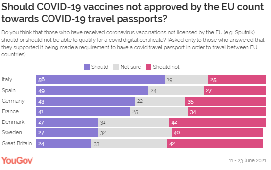 Amongst those who supported the Digital COVID certificate, opinions differ on whether those who have received the vaccines not licensed by the EMA should be able to qualify for one. Italians who support the scheme are most likely to think that travellers who have had a vaccine that has not been licensed by the EMA should still be able to get a certificate, with 56% saying that these travellers should still qualify.