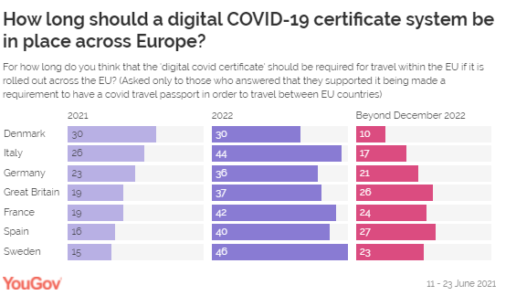 Europeans who support the introduction of the Digital COVID Certificate were also asked how long they think it should be required for travel within the EU. Fewer than one in ten supporters in every country surveyed said that they think the certificate should become redundant at the end of the summer.