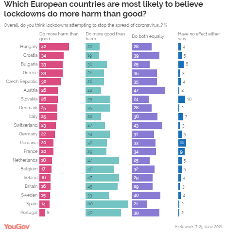 (29%) say it’s done equal good and harm. Portugal and Spain are the least lockdown-sceptic countries in the