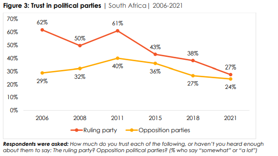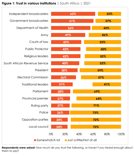 Fewer than two in five South Africans trust the president “somewhat” or “a lot,” and more than two-thirds have “just a little” or “no trust at all” in Parliament, the police, and their local council, according to a new Afrobarometer survey. Public trust in elected representatives is particularly low, and only a quarter of South Africans express trust in either the ruling or opposition parties. Trust in nearly all institutions is low – and declining. Only media broadcasters, both independent (63%) and government (61%), and the Department of Health (56%) enjoy the trust of most citizens.