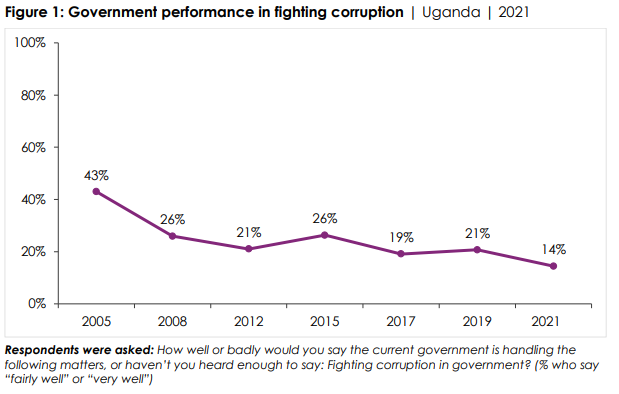 14% Of Ugandans Say The Government Is Performing “Fairly Well” Or “Very Well” In Combating Corruption