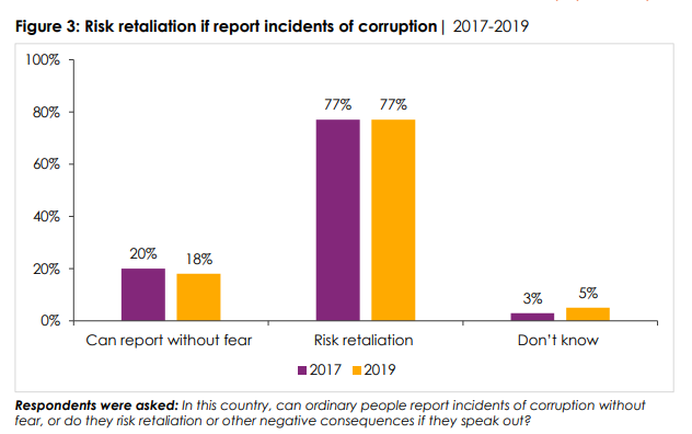 Seven in 10 Ugandans say their government is performing “fairly badly” or “very badly” in combating corruption. More than three-quarters of Ugandans believe that citizens who report corruption to the authorities risk retaliation or other negative consequences. Government’s office and a statehouse anti-corruption unit, have not persuaded the public that the level of corruption in the country is decreasing. A corruption-free Uganda is one of five targets that President Yoweri Museveni has tasked his new cabinet with focusing on over the next five years.