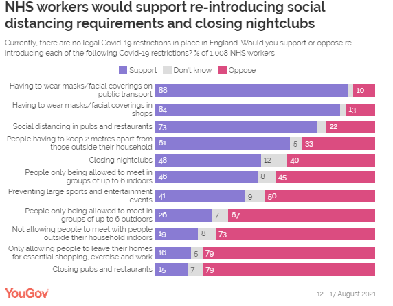 Half of all NHS staff believe the government jumped the gun with ‘Freedom Day’: 48% say coronavirus restrictions ended too soon. Around one in three say the timing was about right, while only 8% say it happened too late. Support is highest making it a legal requirement for people to wear masks on public transport and in shops again, with respectively 88% and 84% in favour. While companies can still demand that customers wear masks to use their services, this stopped being legally required on 19 July.