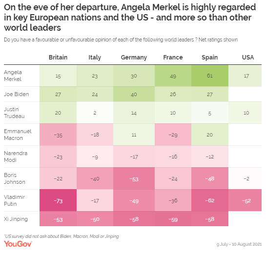 Only US president Joe Biden performs comparably well in European public opinion, although the president has only been in post for half a year (and doubtless still benefits from simply being ‘not Donald Trump’). Please note also that the surveys in Europe were conducted in July, prior to the Afghanistan crisis.