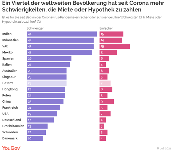 Among European consumers, those surveyed are the least likely to say that they have had greater difficulties paying their housing costs since the Corona crisis - 17 percent of Germans, 13 percent of British, 12 percent of Swedes and 10 percent of Danes have felt this burden. But there are also exceptions in Europe: In Spain, almost three in ten consumers (28 percent) say that it has become more difficult for them to pay for their roof over their heads, among Italians the proportion is almost as high (27 percent) .
