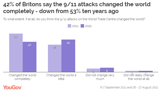 group having been only four years old at the time. Fewer Britons believe 9/11 changed the world completely than ten