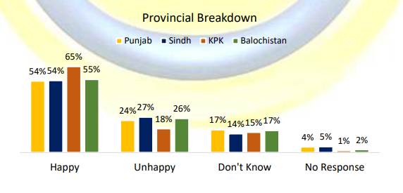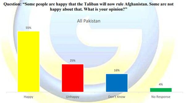 According to a survey conducted by Gallup & Gilani Pakistan, 55% of Pakistanis claim that they are happy that the Taliban will now rule Afghanistan. A nationally representative sample of adult men and women from across the four provinces was asked the following question, “Some people are happy that the Taliban will now rule Afghanistan. Some are not happy about that. What is your opinion?” In response to this question, 55% said they are happy, 25% said they are unhappy, 16% did not know and 4% did not response.