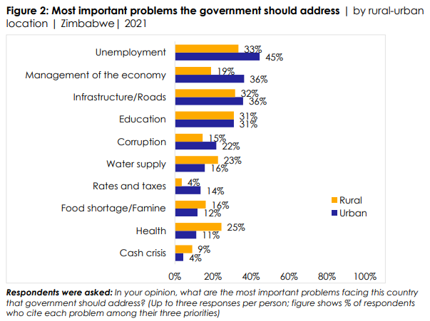 Unemployment is Zimbabweans’ biggest concern, cited by 38% of respondents as one of their top three priorities for government action. Infrastructure/roads (33%), education (31%), management of the economy (26%), and water supply (20%) round out the top five. A lack of jobs is more widely seen as a priority in the cities (45%) than in rural areas (33%), as is management of the economy (36% vs. 19%).