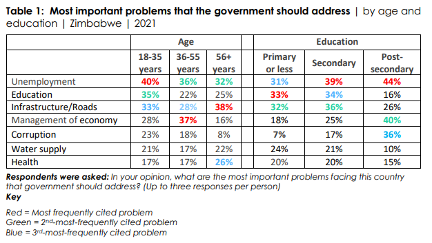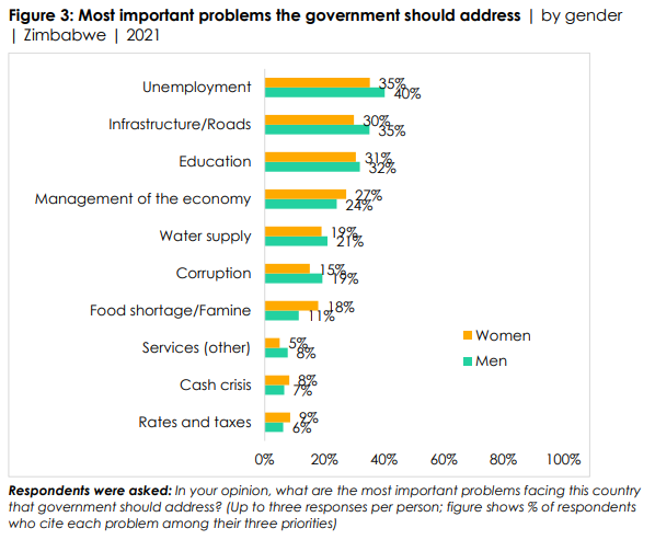 Unemployment Is Zimbabweans’ Biggest Concern, Cited By 38% Of Respondents As One Of Their Top Three Priorities For Government Action