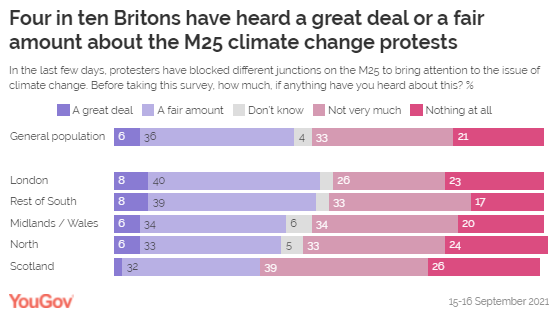 New YouGov polling shows that four in ten Britons have heard “a great deal” or “a fair amount” about the protests (42%), with Londoners and Southerners most likely to be aware (48% and 47%, respectively). Nevertheless, most Britons have heard little (33%) to nothing (21%) about the demonstrations. While many are unaware of the protests, those who have heard much about them are even more negative: opposition to the action grows to 70% amongst Brits who had heard a great deal or fair amount about the protests.