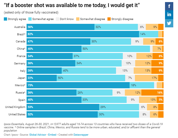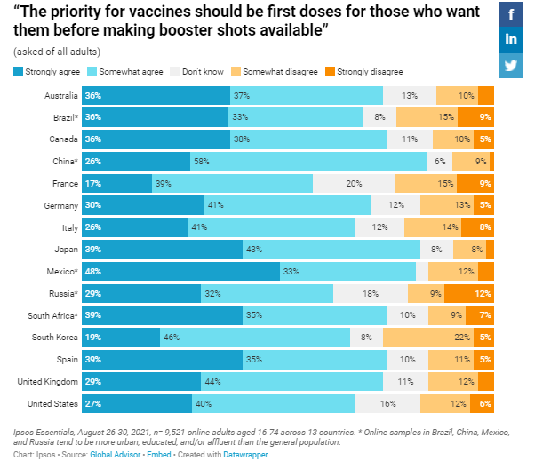The survey was conducted August 26-30, 2021 on Ipsos’ Global Advisor online platform among 9,521 adults under the age of 75, including 5,977 who have already received two doses of a COVID-19.
