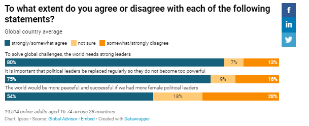 Strong leaders wanted: Four out of five adults (81%) on average across all countries surveyed agree that the world needs strong leaders to solve global challenges. Agreement is highest in China (90%), Australia (88%), and Russia (87%), and lowest in South Korea (68%), Japan (67%), and Italy (67%).