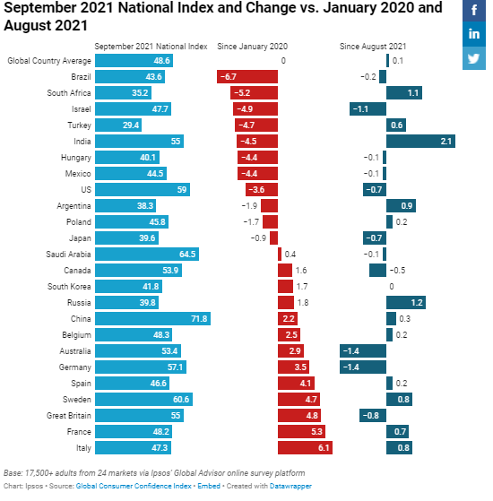 Ipsos’ Global Consumer Confidence Index is now reading at 48.6, up just 0.1 point from last month. As the Delta variant spreads across the globe, global consumer sentiment remains frozen in place, with the September reading marking three consecutive months with nearly no change in consumer confidence.