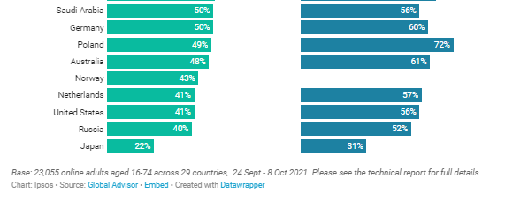 Taiwan (53%), South Korea (52%), Spain (51%) and Greece (47%), people in