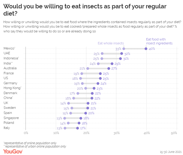 18% would be willing to eat whole bugs. A YouGov US study earlier in the year