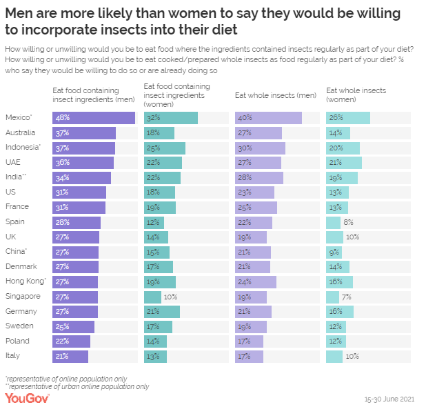 among whom 40% of men and 26% of women could consider it. (YouGov Australia) Source: https://au.yougov.com/news/2021/11/05/one-five-australians-say-theyre-willing-eat-insect/