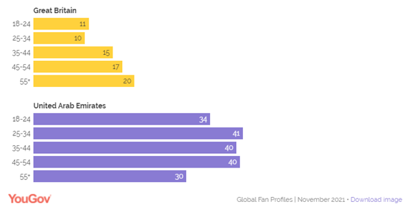 World Cup, and the figure drops to 16% among Brits. The demographic filters in YouGov Global Fan Profiles allow us