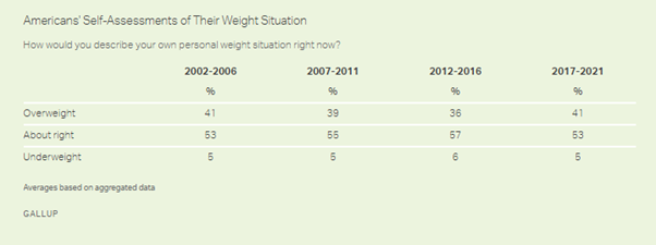 2022 Source: https://news.gallup.com/poll/388460/percentage-americans-consider-themselves-overweight.aspx 724-43-23/Country Profile: