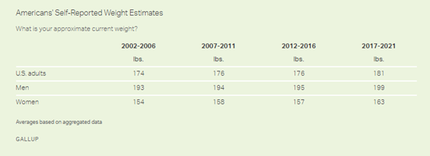 2012-2016 to an average 199 pounds in 2017-2021, while women's is up six