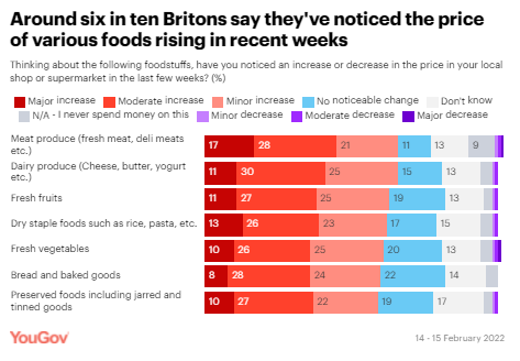 vast majority of Britons have seen prices rise across a range of foodstuffs