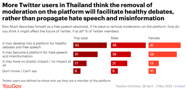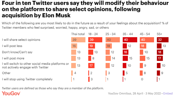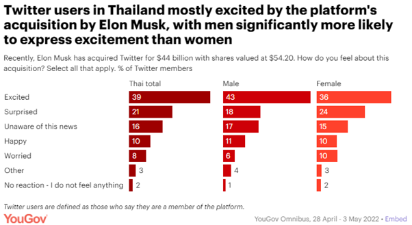 definitive agreement to be acquired by tech mogul and billionaire Elon Musk, latest data from YouGov RealTime Omnibus indicates Thai Twitter users (defined