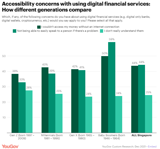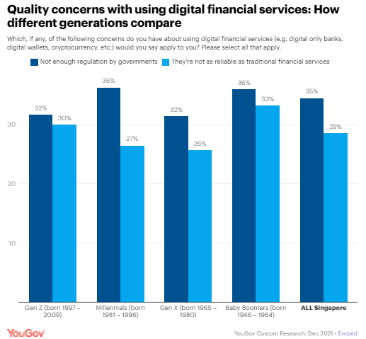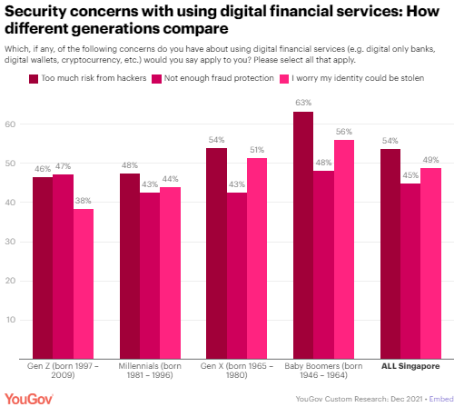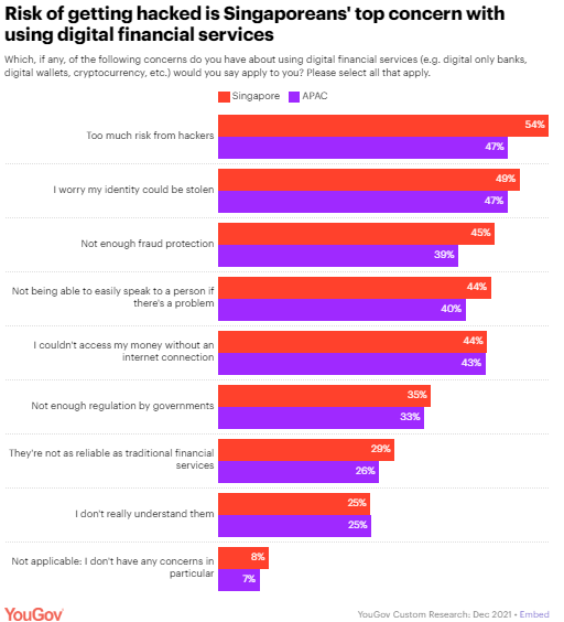 Nearly nine in ten consumers in Singapore have some concerns about using digital financial services – such as digital-only banks, e-wallets and cryptocurrencies (87%).  Research by YouGov shows the top three concerns all revolve around the security of digital finance. More than half of consumers (54%) agree that there is too much risk from hackers, while 49% worry about their identity being stolen, and 45% feel that not enough fraud protection measures are in place.