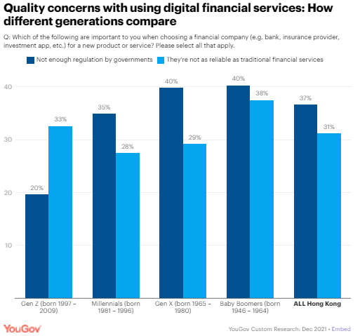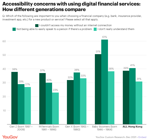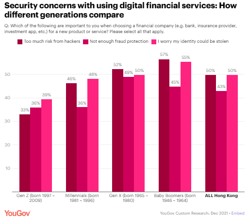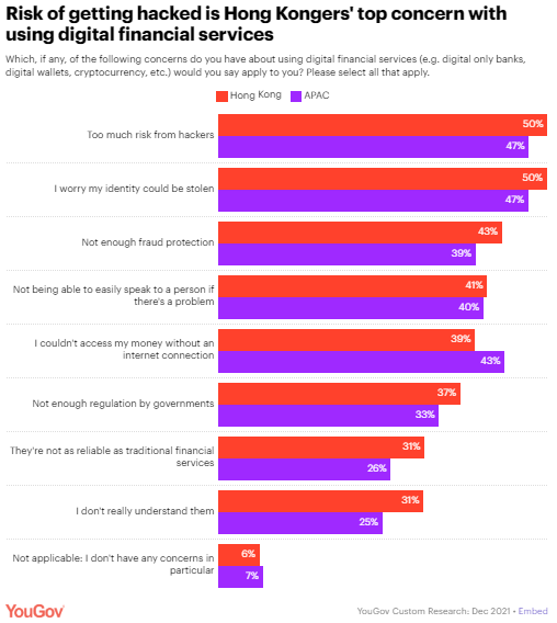 Research by YouGov shows that half of consumers feel there is too much risk from hackers when using digital financial services and worry about their identity being stolen (50%).91% of consumers in Hong Kong have some concerns about using digital financial services – such as digital-only banks, e-wallets and cryptocurrencies.  Additionally, over two in five are concerned about there not being enough fraud protection (43%) and not being able to easily speak to a person if they run into problems while using digital financial services (41%).