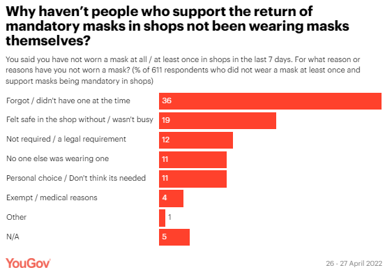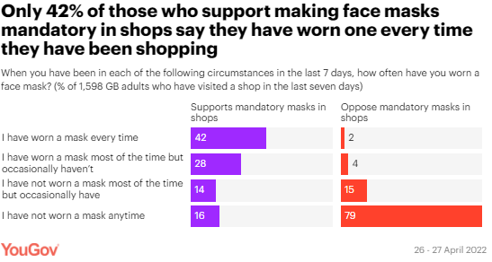 With Scotland lifting their rules on wearing masks in crowded places earlier this month, it is no longer a legal requirement to do so in any of the British nations. New YouGov data suggests that the public would prefer if these rules were still in place, however, with six in ten (62%) saying they support the reintroduction of mandatory masks in shops. Just a third of Brits (33%) oppose the return of the mask.