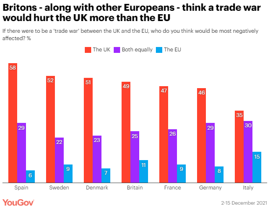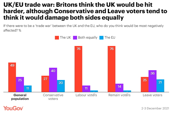 A YouGov Eurotrack survey conducted in December 2021 found that, in all seven countries surveyed, people tended to think that the UK would come off worse in a UK-EU trade war. This includes 49% of Britons, compared to 25% who think both sides would be equally hit, and just 11% who think the EU would be most negatively impacted.