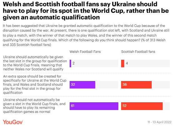 Most refuse to give Ukraine any special treatment at all. Three in five football fans in Wales (61%) and half of those in Scotland (52%) think the remaining qualification games should continue as usual, without special considerations for Ukraine.