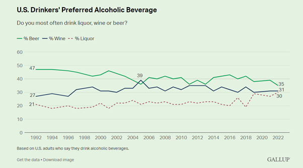 alcohol that drinkers in the U.S. choose most often has varied somewhat over