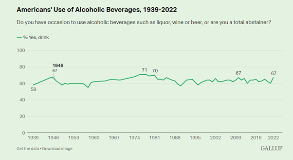 tracked the public's alcohol use since 1939. That year, 58% of U.S. adults