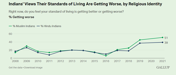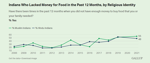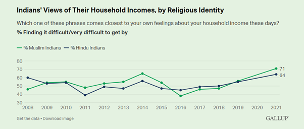 India. (Gallup) AUGUST 15, 2022 Source: https://news.gallup.com/poll/396887/economic-pain-uneven-india-muslim-hindu-populations.aspx SUMMARY