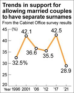 the government should allow married couples to have separate surnames. A record high 42.2 percent in the latest survey said