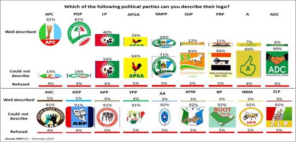 A new public opinion poll conducted by NOIPolls has revealed that the top three political party logos properly described in Nigeria are those of the All-Progressive Congress (APC), People’s Democratic Party (PDP) and the Labour Party (LP). The APC and PDP logos had larger proportion of adult Nigerians (82 percent each) who could easily describe the party’s logos, while 40 percent had good description of the Labour party logo amongst other party logos.