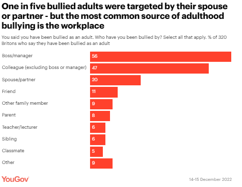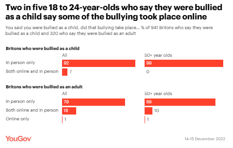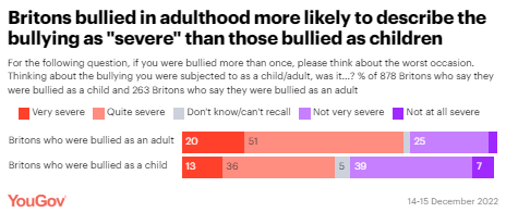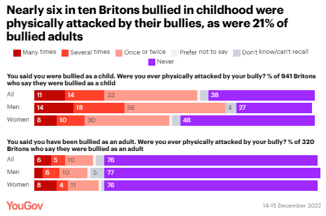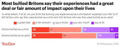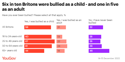 Two thirds of Britons (66%) say they have been bullied at some point in their lives, according to a new YouGov poll. One in five people (21%) say they experienced bullying as an adult, while six in ten Britons (59%) were bullied as a child (some respondents will have been bullied in both childhood and adulthood). Older Britons aged 65 and over are least likely to say (or remember) that they’ve been bullied, with 52% saying they have been, compared to between 63% and 72% of other age groups.