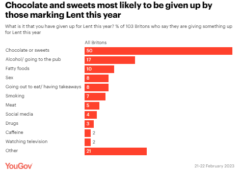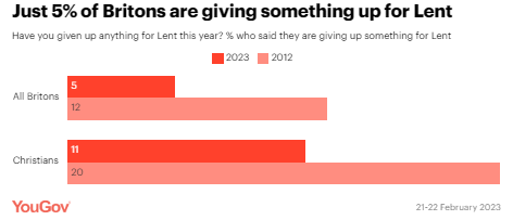 The centuries-old Christian tradition of Lent will see millions across the world give up something they love for the 40 days leading up to Easter. But just 5% of Britons are partaking in the ancient festival this year, including just 11% of British Christians. That represents a notable fall since 2012, when 12% of Britons and 20% of British Christians marked the occasion. One in ten (10%) have turned their back on fatty foods, while 8% are abstaining from sex and the same proportion are giving up eating out and takeaways (8%).