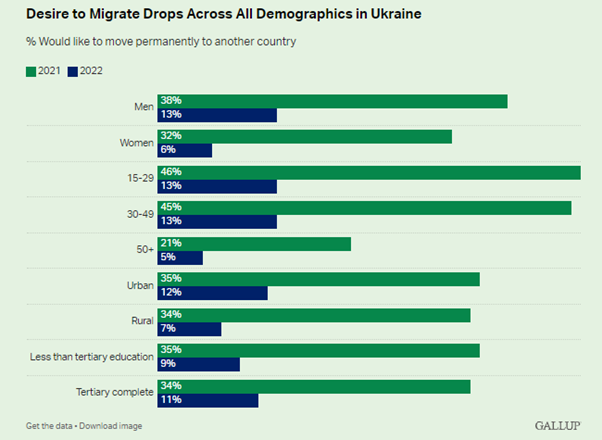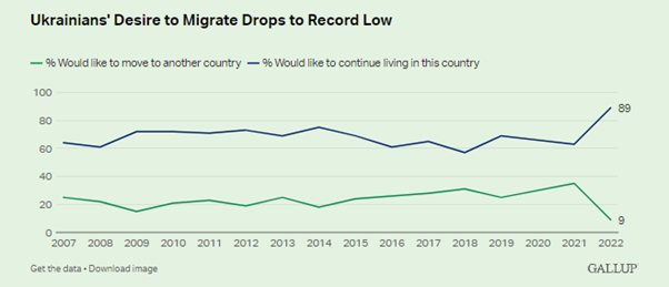 Before Russia invaded Ukraine a year ago, more Ukrainians than ever said they would like to leave Ukraine permanently. But that desire quickly faded after the war began, and now, most Ukrainians do not want to leave even if they could. A record-low 9% of Ukrainians surveyed in September of last year -- almost seven months into Russia’s war with their country -- said they would like to leave Ukraine permanently, which is down sharply from a record-high 35% just the year before.