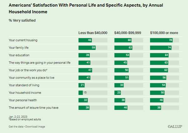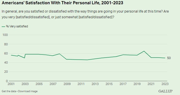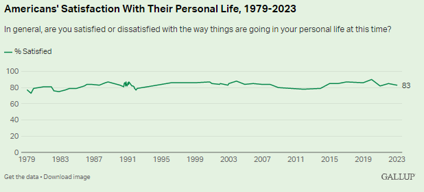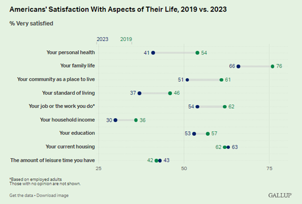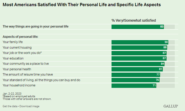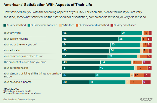 The 83% of Americans who are at least somewhat satisfied with their personal life matches the historical average since 1979, and broad majorities of U.S. adults likewise report they are satisfied with nine specific life aspects. Between 81% and 90% of U.S. adults are either “very” or “somewhat” satisfied with their family life, current housing, education, job, community and personal health, while 71% to 77% express the same degree of satisfaction with the amount of leisure time they have, their standard of living and their household income.
