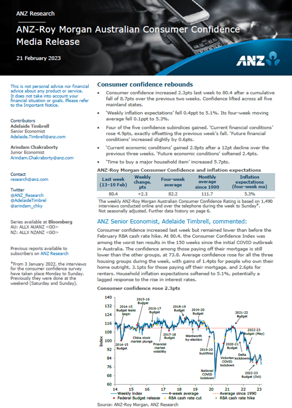 ANZ-Roy Morgan Consumer Confidence recovered slightly this week, up 2.3pts to 80.4. However, Consumer Confidence is still a large 21.4pts below the same week a year ago, February 14-20, 2022 (101.8). Consumer Confidence is now 3.9pts below the 2023 weekly average of 84.3.